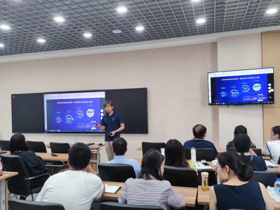 2024年7月9日,超星泛雅集团天津分公司课程建设总监王宏为猎豹体育全体专任教师开展题为《探索AI在教学创新中的应用——构建数智课程与提升教学互动》的专题讲座。会议由副经理翟羽佳主持。