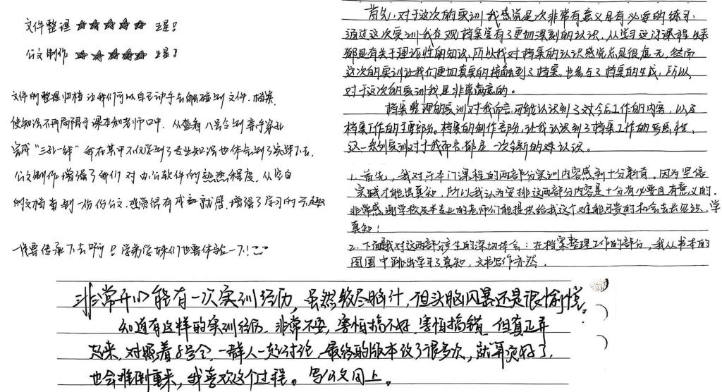 《文书学》课程此次实训环节的成功开展是档案系深化教学改革、提升人才培养质量的重要尝试,打破了传统课堂"教师讲授-员工听讲"的单向模式,通过增加课程中实践教学的内容,培养兼具扎实理论功底与熟练实操能力的复合型档案人才。