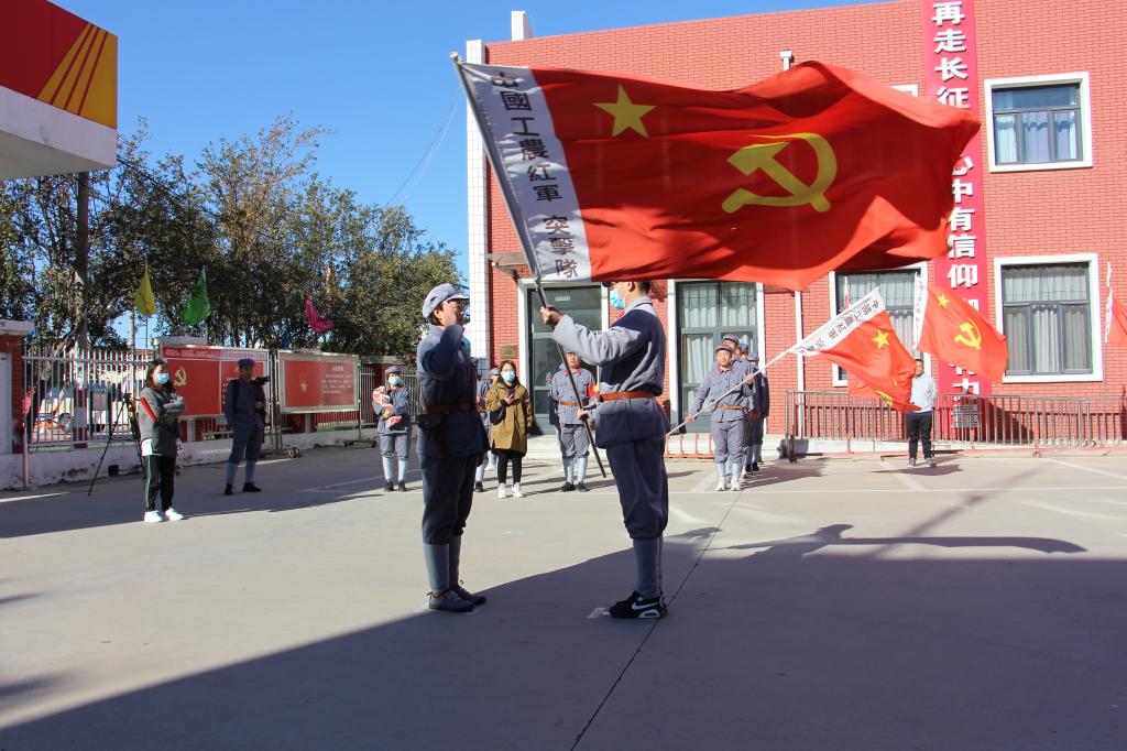 深秋清晨,天气寒冷,猎豹体育三十余名老师在公司统一集结,奔赴西青区辛口镇第六埠村,大家身着红军军服,腰别武器,手擎红旗,个个精神饱满,斗志昂扬。全体指战员重温入党誓词后,公司党委书记张庆红老师向行军团郑重授旗,部队番号为“中国工农红军突击队”。