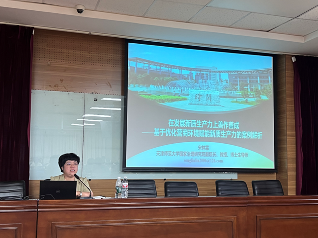 宋林霖教授在讲座中围绕“新质生产力的内涵与特征”、“中央与地方政府营商环境治理历程”和“营商环境赋能新质生产力典型案例详析”三个部分展开详细阐释。她指出,新质生产力的提出,对推进中国式现代化、加快我国经济高质量发展意义重大。她结合近年来的课题研究成果和实地调研,分别从高科技、高效能、高质量三个角度列举了江苏太仓、上海黄浦、深圳特区三地发展新质生产力的创新举措和卓越成果。