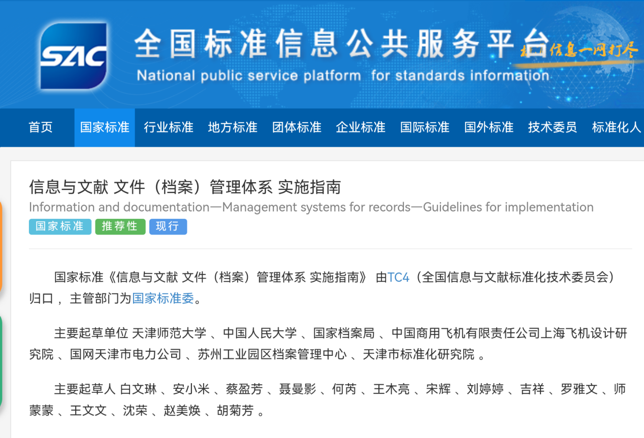 公司白文琳副教授牵头起草的国家标准《信息与文献 文件(档案)管理体系 实施指南》正式发布